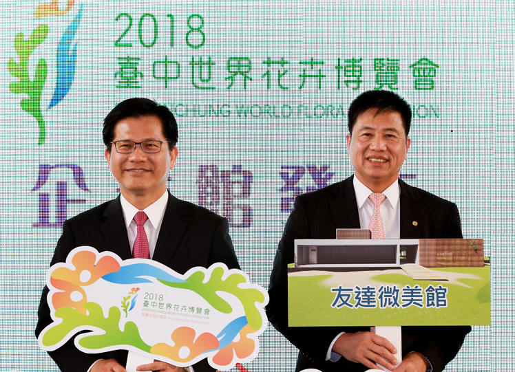 友達贊助 2018 臺中花博企業館,打造「友達微美館」(左:臺中市長林佳龍,右:友達光電董事長暨執行長彭雙浪) |