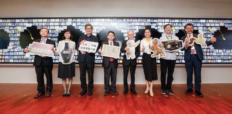 友達(dá)攜手創(chuàng)利空間為故宮建置的智慧文物互動導(dǎo)覽牆及輪播牆,今日正式啟用 (左四:友達(dá)新事業(yè)暨投資管理總部副總經(jīng)理楊本豫、右四:國立故宮博物院院長吳密察、右三:太極影音董事長黃寶雲(yún))